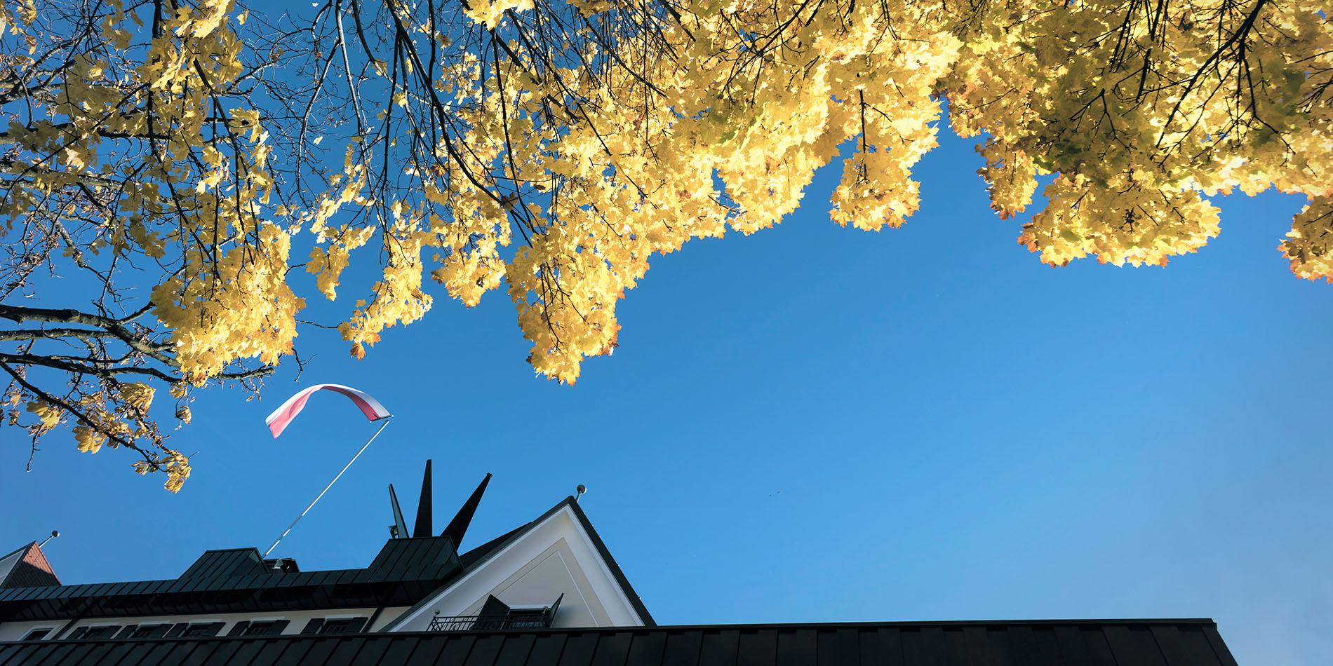 Der Himmel stahlblau über goldenen Wäldern, die Sicht zu den Bergen am Horizont gestochen klar. Das ist das Schauspiel, das Sie im Herbst bei uns erwartet und auch uns jedes Jahr aufs Neue mit seiner Schönheit überrascht und staunen lässt. Kein Wunder, dass sich unsere Gäste im Herbst, auch bei kühleren Temperaturen, am liebsten im Freien aufhalten, auf der Panoramaterrasse, im Park oder natürlich beim Wandern.Alles über unsere Lage