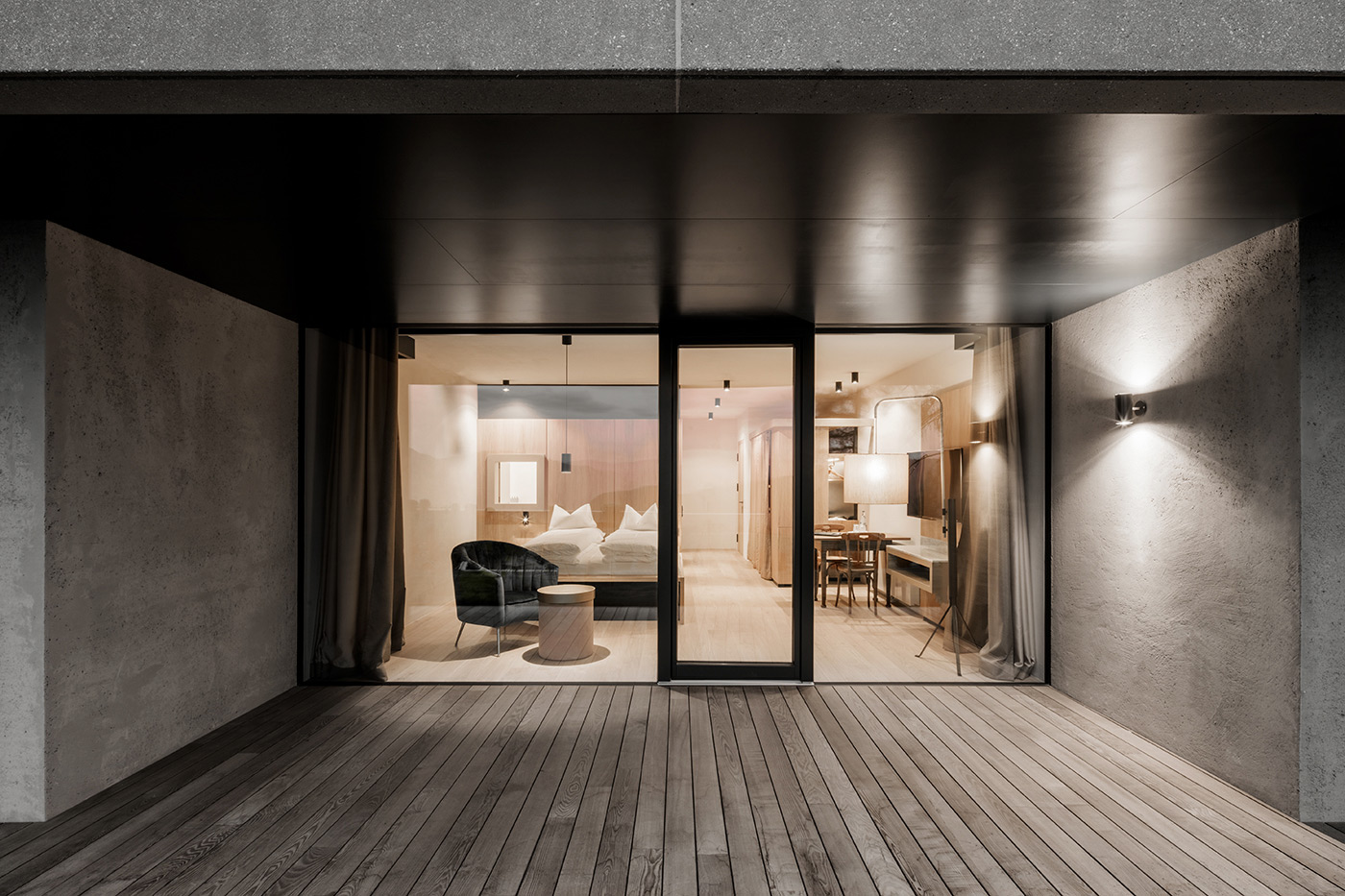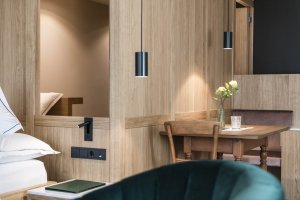 Im Holzner trifft Alpiner Jugendstil auf die klare Linienführung zeitgenössischer Architektur. Die von 2013 bis 2018 umgesetzten Erweiterungen verstehen sich in Holzner’scher Tradition als behutsames Weiterbauen am Bestand. „Im Mittelpunkt der Eingriffe steht das historische Gebäude, wobei sich das Neue zu Gunsten des Bestandes zurücknimmt. Alt und neu gehen eine Symbiose ein und wachsen somit gemeinsam zu einer Einheit,“ erklärt das Architektenduo BergmeisterWolf den zugrundeliegenden Ansatz. Ausgewählte Materialien und ein klares Design ziehen sich heute durch alle Innenräume und verbinden alt und neu zu einer harmonischen Einheit. Die neuen Elemente integrieren sich leise in das bestehende Ensemble, verlängern den Jugendstil-Bau und treten in den Dialog mit der umliegenden, behutsam gezähmten Landschaft.