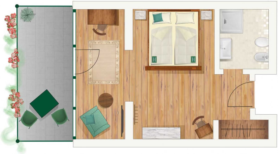 2 Personen – 40 m² inkl. 10 m² Terrasse||